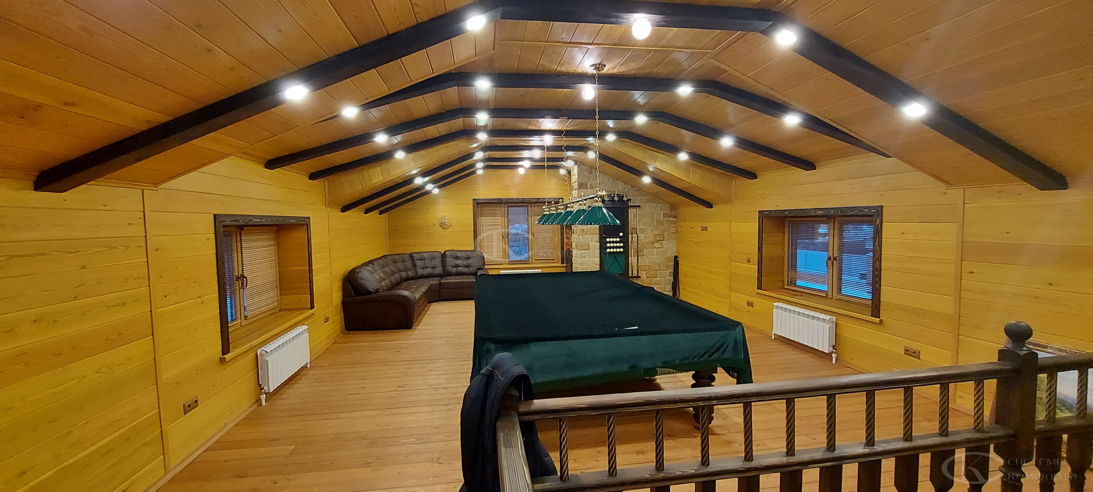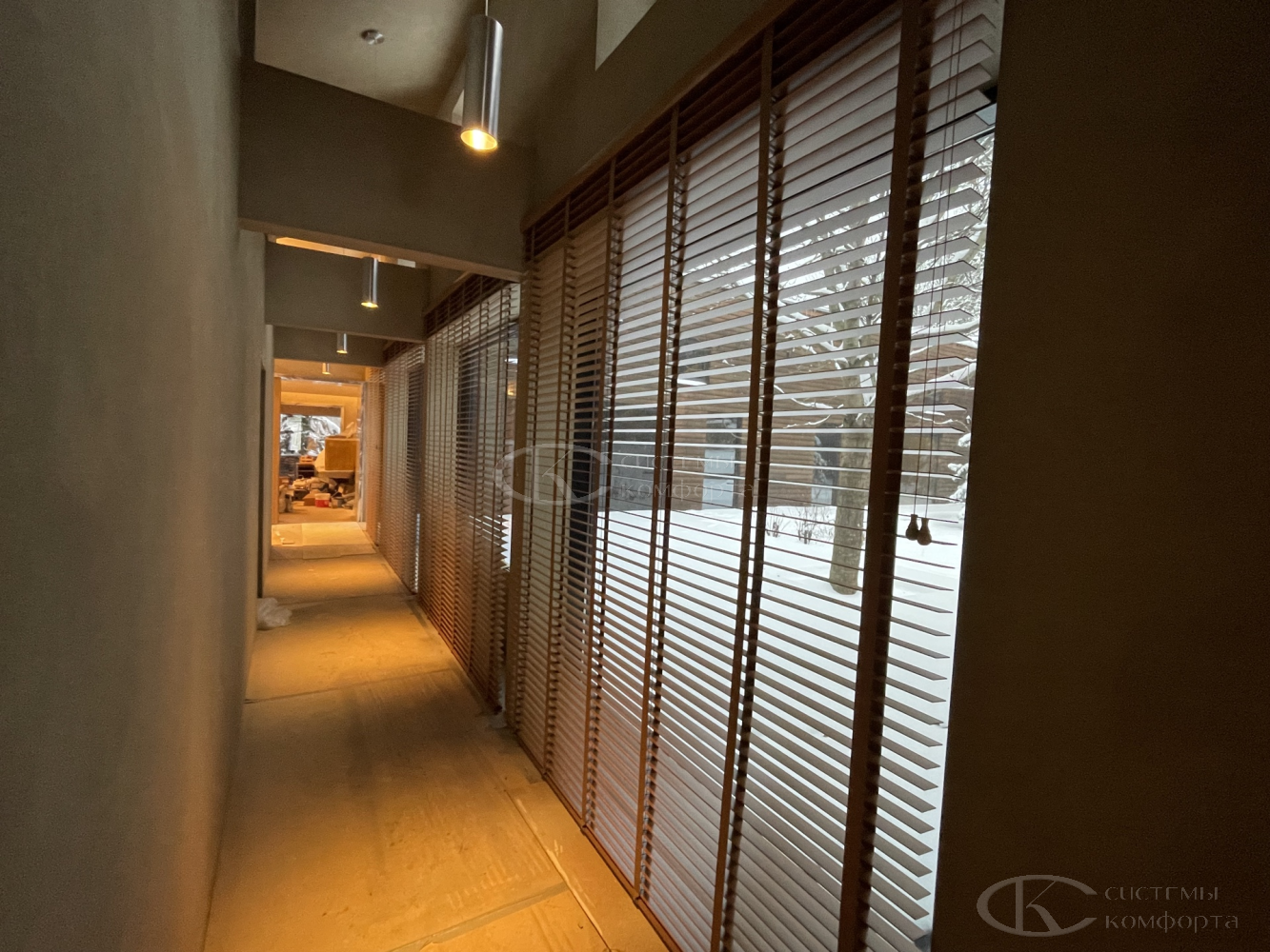 Это тот самый знакомый всем образ: аккуратные горизонтальные ламели на тонких лесках или тросиках. Но современные горизонтальные жалюзи для частных домов ушли далеко вперед от стереотипных «офисных» моделей.